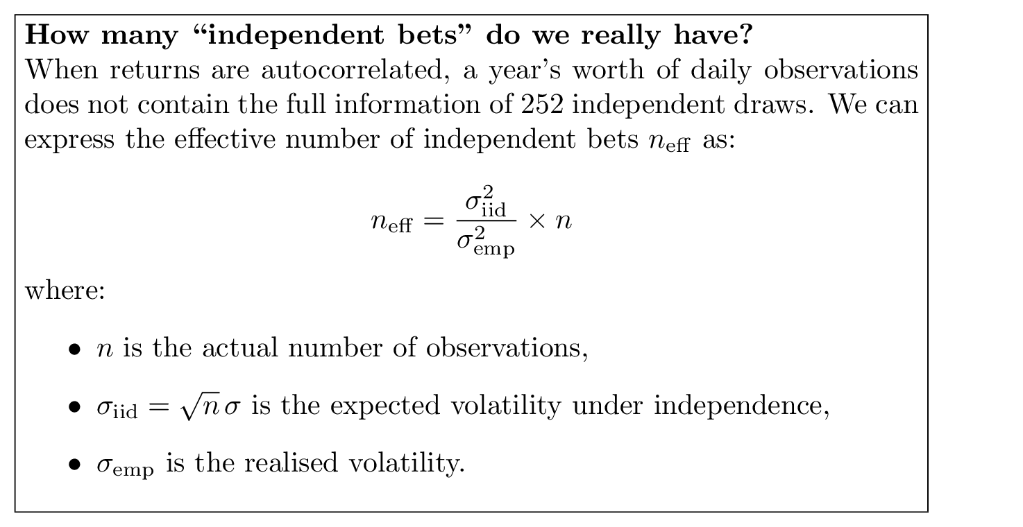 We can visualise this effect by plotting the effective number of independent bets against the degree of autocorrelation. As shown in Fig. 7, even modest positive autocorrelation sharply reduces the effective sample size. What looks like a year of 252 daily returns may, in practice, contain far fewer truly independent observations. This reduction directly weakens the diversification benefit and slows the convergence of return distributions toward normality.